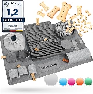 Schnüffelmatten sind besonders praktisch bei schlechtem Wetter, für Wohnungen oder für ältere Hunde. Sie sind in verschiedenen Größen und Schwierigkeitsgraden erhältlich. Als Ergänzung eignen sich auch Futtersuchspielzeuge für noch mehr Abwechslung.